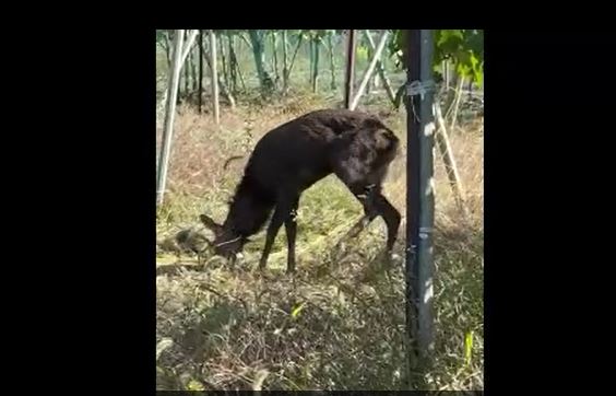 ブドウ畑で侵入防止用のネットに角がからまって暴れているシカ。