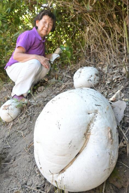 茨城県鹿嶋市津賀の永作幸雄さん(78)、てるさん(77)夫妻宅近くで、オニフスベとみられる大型キノコが生えているのが見つかった。