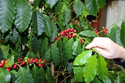 上田市の松橋みち子さん(78)が10年ほど育ててきたコーヒーの木が今年初めて、500粒近い大量の赤い実を結んだ。