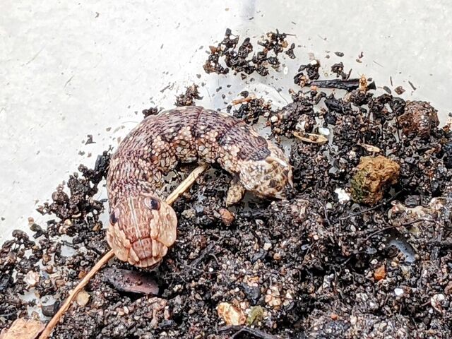 爬虫(はちゅう)類などに詳しい県立人と自然の博物館(三田市)の太田英利・主任研究員によると、正体はガの幼虫だった。スズメガ科、ホウジャク亜科に属するビロードスズメというガで、発見された際の状態は、さなぎになる直前の段階という。捕食者である鳥類へのけん制としてヘビに擬態しているといわれ、