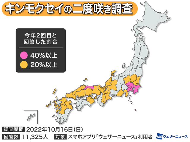 昨日16日(日)にウェザーニュースアプリの利用者に近所でキンモクセイの香りを「今年初めて(香った)」「今年2回目(で香った)」「香ってない」の3択で調査を実施。