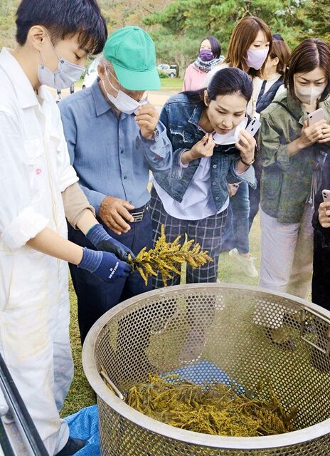 大田市の国立公園・三瓶山周辺に点在する「セイタカアワダチソウ」を使ったイベントが22日、同市三瓶町の三瓶山西の原であった。日本では厄介な雑草と捉えられがちだが、欧米などでは薬草として活用されており、参加者はアロマオイルやブレンドティー作りを通して、外来種植物の側面を学んだ。
