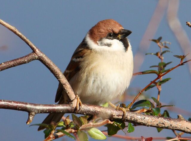 早朝の木々に降り立ったのは、ずいぶんと丸いフォルムになったスズメ。寒さから身を守るため、気温が下がると脂肪を蓄えたり、