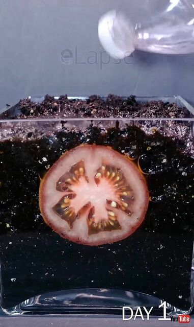 カットしたトマトを土に埋めて観察(以下画像はYouTubeより)